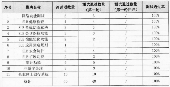 功能性方面:测试范围包括网络功能测试、SLB健康检查、SLB负载均衡算法、SLB会话保持功能、SLB安全防护、SLB扩展测试等11个模块,共计执行40条用例,均通过测试。
